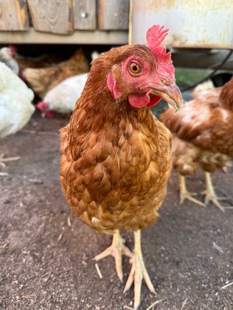 Hilde kommt aus einem Freiland-Betrieb. Das klingt erstmal idyllisch, ist es aber nicht. Der Landwirt hat die Hennen genau 2 Mal gesehen: Beim Einstallen und Ausstallen. In der Zeit dazwischen sind 30 Hennen gestorben, ohne dass dies überhaupt bemerkt wurde. Hilde hat einen verwachsenen Schnabel, einen sogenannten Kreuz-Schnabel. Rechtzeitig bemerkt, kann man hier gegensteuern. Bei Hilde ist das aber nicht aufgefallen und so verformte sich ihr Schnabel dauerhaft. Der obere und untere Teil des Schnabels wachsen aneinander vorbei statt bündig aufeinander. Das erschwert ihr das Essen. Länger im Betrieb, und sie wäre vermutlich verhungert. Die Fehlstellung lässt sich nicht mehr korrigieren, aber durch das regelmäßige vorsichtige Schleifen des Schnabels kann die Futteraufnahme deutlich verbessert werden. Sobald unsere Federstark-Gruppe (Gruppe für Hühner mit Beeinträchtigungen) einzugsbereit ist, wird Hilde dort hin wechseln, damit wir noch besser auf ihre Bedürfnisse eingehen können.